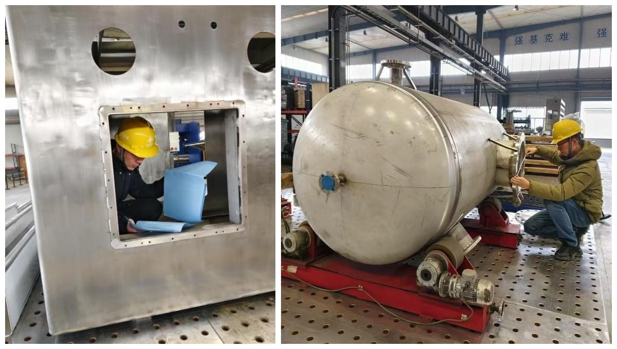 高密封等級屏蔽工作箱制造現(xiàn)場,車間負(fù)責(zé)人崔建福正和車間工藝孫禮泉、調(diào)度芮振康等主要成員對手套箱制造過程中的焊接、校形問題開展激烈討論,交貨期的緊迫雖然壓彎了他的眉頭,但他依然沉著冷靜,有條不紊的趕在業(yè)主驗(yàn)收前解決問題。涉核壓力容器產(chǎn)品數(shù)量多,材料和產(chǎn)品結(jié)構(gòu)多樣,技術(shù)要求復(fù)雜,車間工藝人員張敏和王晗一方面在車間積極與技能人員溝通,協(xié)調(diào)技術(shù)、焊接及裝配制造問題,另一方面努力與質(zhì)保人員協(xié)調(diào)后續(xù)質(zhì)量保證資料的細(xì)節(jié)問題。車間總有困難無數(shù),但他們始終不畏艱難、披荊斬棘。在產(chǎn)品安裝現(xiàn)場,車間工藝人員李志超克服嚴(yán)寒,每天深入產(chǎn)品安裝場地,縱然臉部通紅,手腳冰涼依然無法阻擋他那顆愛崗敬業(yè),勇往直前的心。